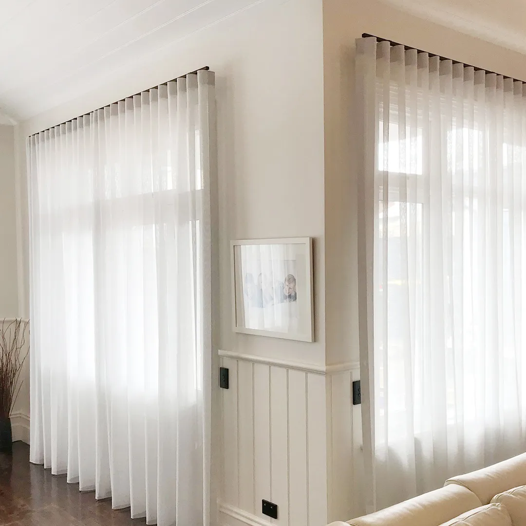 Motorised blockout roller blinds behind sheers in Kew Natural (not visible in this photo)