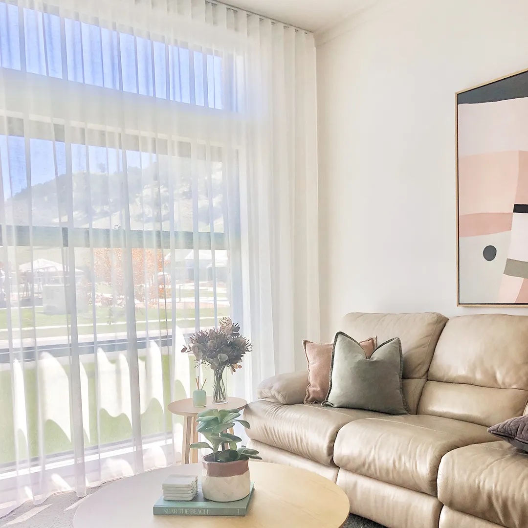 This was not my first rodeo ordering and installing iSeekBlinds products! It was a no-brainer when it came to ordering window furnishings for our new build. I went for the motorised roller because the drop was so long and to avoid dirty fingers on our beautiful white sheers! I have used the Bali sheer fabric before and loved its linen-look drape and weight and knew the Pearl colour would be beautiful with our Dulux Natural White walls. All of our guests make a beeline for the formal living room because it feels so good to sit in.