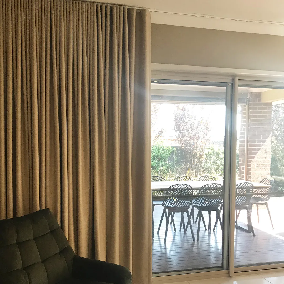 roller blinds for daytime privacy when they are open. Made here in our Melbourne warehouse, our custom made s-fold blockout curtains and tracks are manufactured to your specifications, with a minimum 200% fullness using beautiful designer fabrics. Select your fabric and preferred track option, then opt for a wall or ceiling mount depending on your room and the look you’re after.