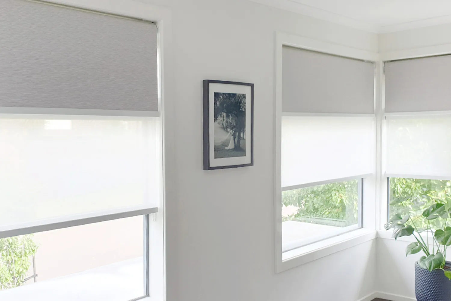 Double roller blind technology allows you to have two blinds on a single bracket, giving you ultimate flexibility. With double roller blinds installed on your window, you can switch between your choice of blockout, sunscreen and light filtering fabrics to get the perfect amount of insulation, shade, or privacy for your space.