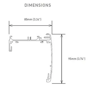 The Pelmet 95 extends 85mm out from the architrave and has a height of 95mm. The diagram here represents a side view of the Pelmet 95.